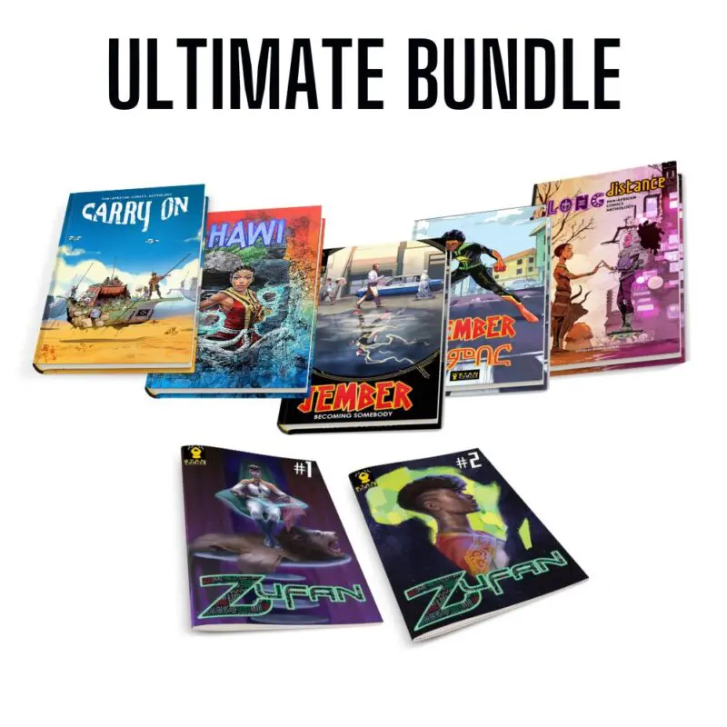 • Full-color anthologiesย each featuring 10 original storiesย of African Folklore, History and Africanfuturisim. Made by creators from Ethiopia, Nigeria, Congo, South Africa and more!